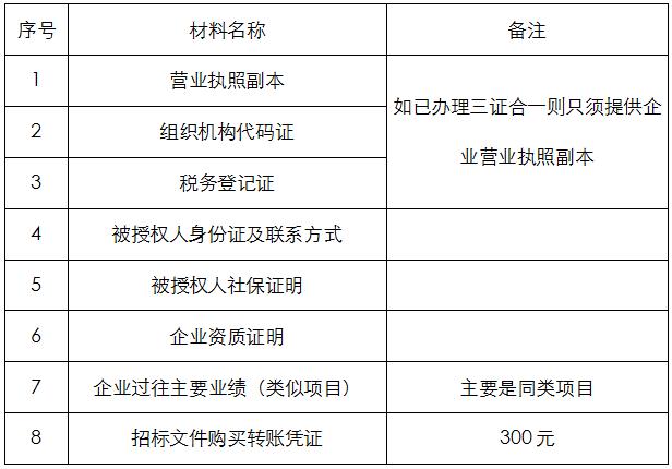 2、凡有意向參加投標(biāo)者,請在上述期間內(nèi)按下表提供報名資料,相關(guān)證明文件的原件如無法提供原件則提供復(fù)印件加蓋公司公章,投標(biāo)人須將上述資料的掃描件發(fā)郵件至招標(biāo)聯(lián)系人處進行報名。