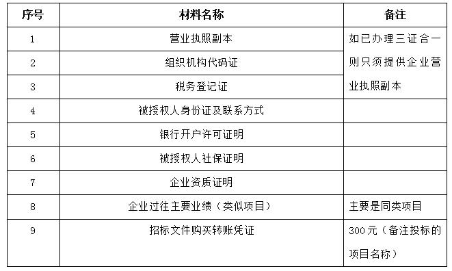 2、 凡有意向參加投標者,請在上述期間內按下表提供報名資料,相關證明文件的原件如無法提供原件則提供復印件加蓋公司公章,投標人須將上述資料的掃描件發郵件至招標聯系人處進行報名。
