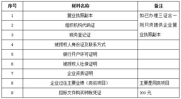 2、 凡有意向參加投標者,請在上述期間內(nèi)按下表提供報名資料,相關(guān)證明文件的原件如無法提供原件則提供復印件加蓋公司公章,投標人須將上述資料的掃描件發(fā)郵件至招標聯(lián)系人處進行報名。