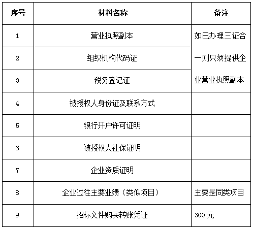 2、 凡有意向參加投標者,請在上述期間內按下表提供報名資料,相關證明文件的原件如無法提供原件則提供復印件加蓋公司公章,投標人須將上述資料的掃描件發郵件至招標聯系人處進行報名。
