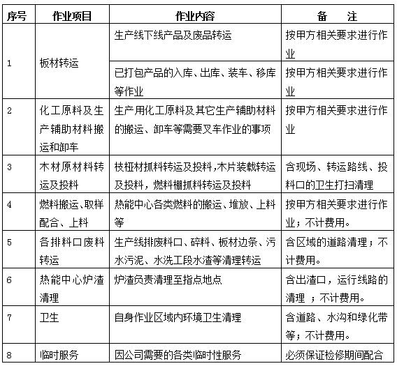 滿足我方24小時不間斷作業,將我生產所需的木片、燃料、水渣、廢料、灰渣等按要求轉運到我方指定區域。在我方生產設備檢修期間必須按我方需要協助檢修工作。
