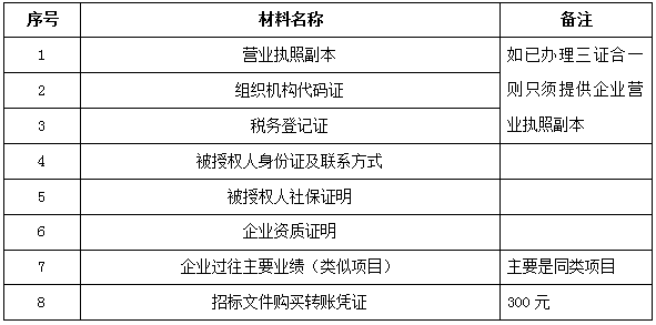 2、 凡有意向參加投標者,請在上述期間內按下表提供報名資料,相關證明文件的原件如無法提供原件則提供復印件加蓋公司公章,投標人須將上述資料的掃描件發郵件至招標聯系人處進行報名。