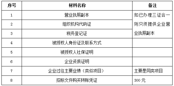 2、 凡有意向參加投標者,請在上述期間內按下表提供報名資料,相關證明文件的原件如無法提供原件則提供復印件加蓋公司公章,投標人須將上述資料的掃描件發郵件至招標聯系人處進行報名。