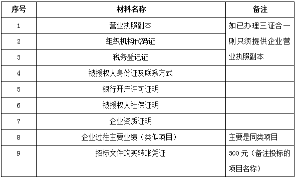 2、 凡有意向參加投標(biāo)者,請(qǐng)?jiān)谏鲜銎陂g內(nèi)按下表提供報(bào)名資料,相關(guān)證明文件的原件如無(wú)法提供原件則提供復(fù)印件加蓋公司公章,投標(biāo)人須將上述資料的掃描件發(fā)郵件至招標(biāo)聯(lián)系人處進(jìn)行報(bào)名。