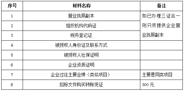 2、 凡有意向參加投標者,請在上述期間內按下表提供報名資料,相關證明文件的原件如無法提供原件則提供復印件加蓋公司公章,投標人須將上述資料的掃描件發郵件至招標聯系人處進行報名。