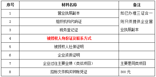2、 凡有意向參加投標(biāo)者,請在上述期間內(nèi)按下表提供報名資料,相關(guān)證明文件的原件如無法提供原件則提供復(fù)印件加蓋公司公章,投標(biāo)人須將上述資料的掃描件發(fā)郵件至招標(biāo)聯(lián)系人處進行報名。
