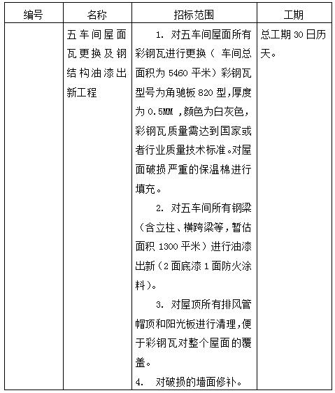 2、 工程規模: 彩鋼瓦進行更換車間總面積為5460平米,五車間所有鋼梁含立柱、橫跨梁等,暫估面積1300平米,進行油漆出新以及其他零星墻面修補。