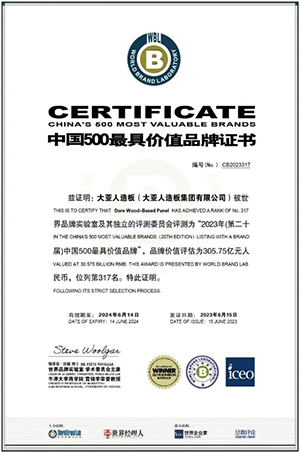 2023年,大亞人造板以305.75億元品牌價值蟬聯中國人造板行業榜首,價值增幅33.6%!品牌排名317位,第六次榮登最具價值品牌(人造板行業)榜首!