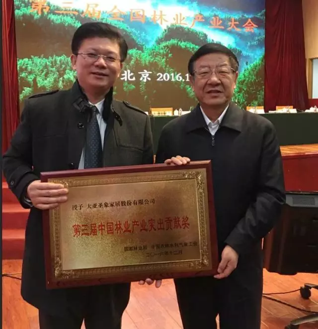 作為首批國家林業重點龍頭企業,大亞科技集團有限公司應邀出席23日上午北京主會場現場大會。會上,大亞科技集團董事局主席、總裁陳曉龍先生獲得“第三屆中國林業產業突出貢獻獎”個人獎榮譽,大亞圣象家居股份有限公司獲得“第三屆中國林業產業突出貢獻獎”單位獎榮譽,大亞人造板集團副總裁程杰先生獲得“第三屆中國林業產業創新獎”個人獎榮譽。