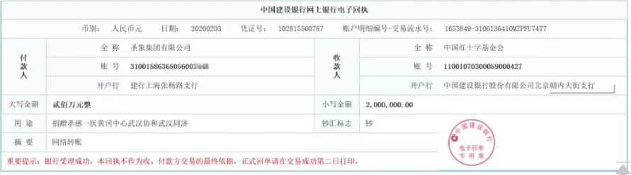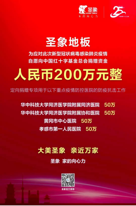 目前新型冠狀病毒感染肺炎疫情形勢(shì)嚴(yán)峻,圣象集團(tuán)心系前線醫(yī)護(hù)人員、心系疫區(qū)人民,同時(shí)也謹(jǐn)記肩負(fù)社會(huì)責(zé)任,自愿向中國(guó)紅十字基金會(huì)捐贈(zèng)資金人民幣貳佰萬(wàn)元整,所涉資金為合法所有且有權(quán)捐贈(zèng),希望定向捐贈(zèng)專項(xiàng)用于湖北當(dāng)?shù)厥芤咔橛绊懽顕?yán)重的四家醫(yī)院,協(xié)助購(gòu)買醫(yī)用防護(hù)物資,緊急支援疫情抗擊及防治工作。